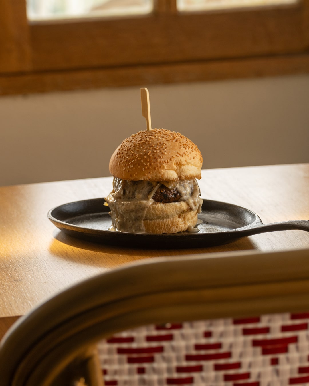 Steak haché 150g VBF, truffe, Comté affiné, oignons confits, moutarde, frites maison et salade (option végé) / Minced beef 150g VBF, truffle, aged Comté cheese, caramelized onions, mustard, homemade fries and salad (veggie option)