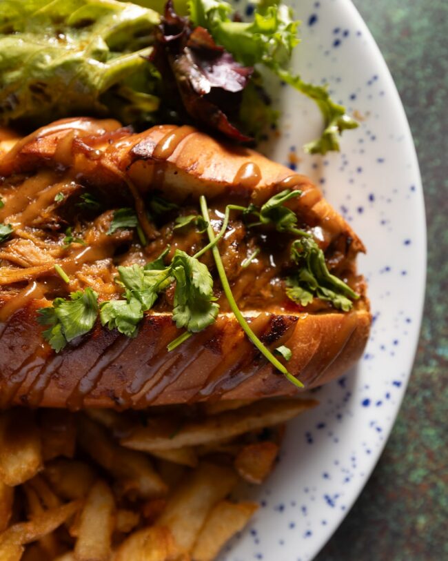 Effiloché de porc aux épices cajun, pain brioché, sauce cacahuètes / Pulled pork with Cajun spices, brioche bun, peanut sauce