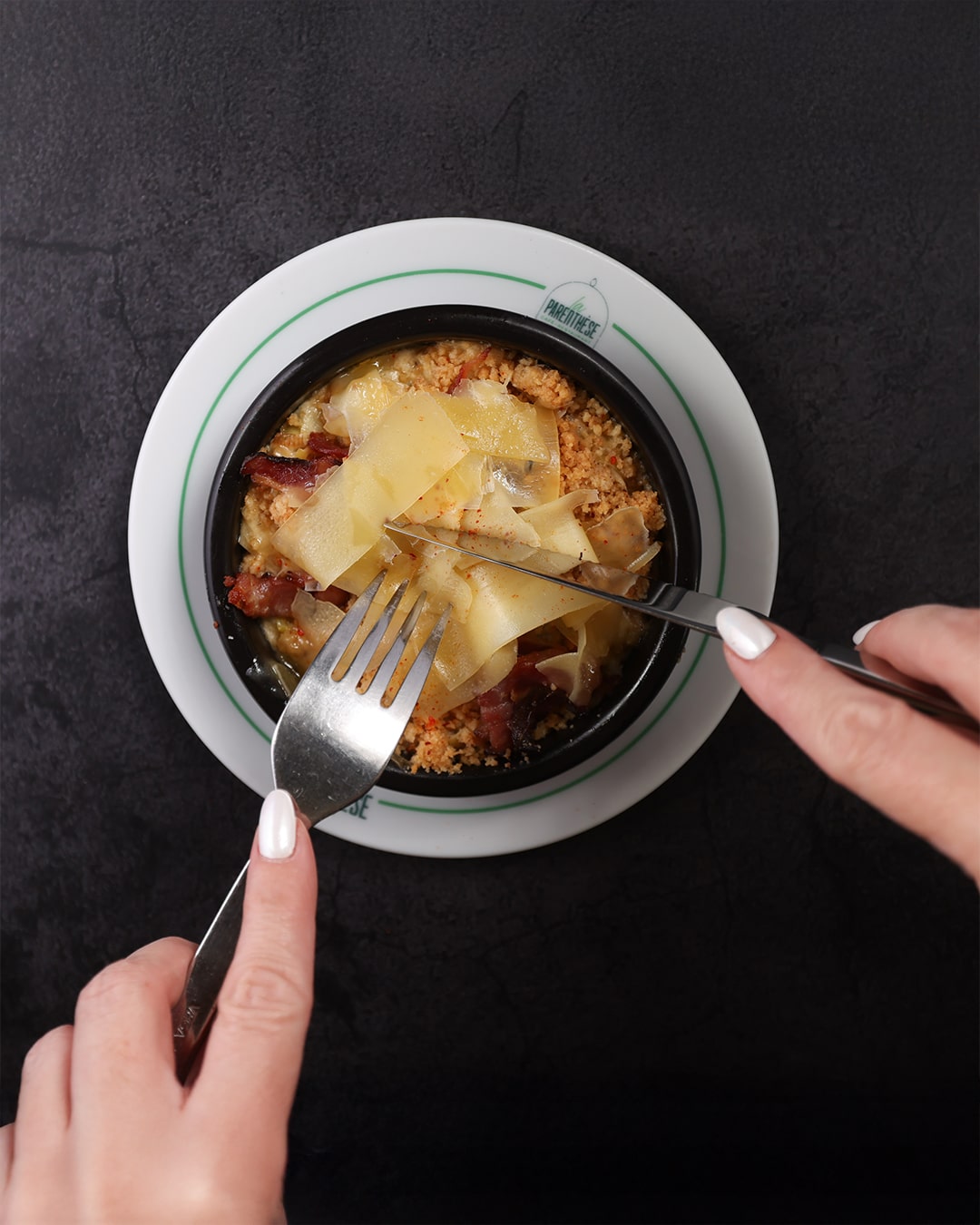 Fondue de poireaux, crumble noisette, comté et lard croustillant / Leeks’ fondue with hazelnut crumble, comté cheese, crispy bacon