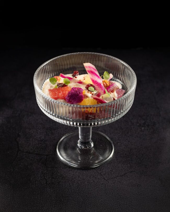 Daurade en gravlax à la vodka et betterave, crème aigrelette, pickles de choux et agrumes – servi comme un cocktail / Vodka and beetroot , sour cream, pickled cabbage and citrus – served like a cocktail
